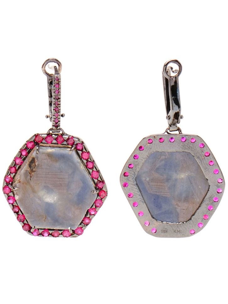 Eighteen carat white gold with black rhodium set with hexagonal sapphire slice from Kimberly McDonald. Irregular ruby pave trimmed sapphire slice. For pierced ears; hook clasp.